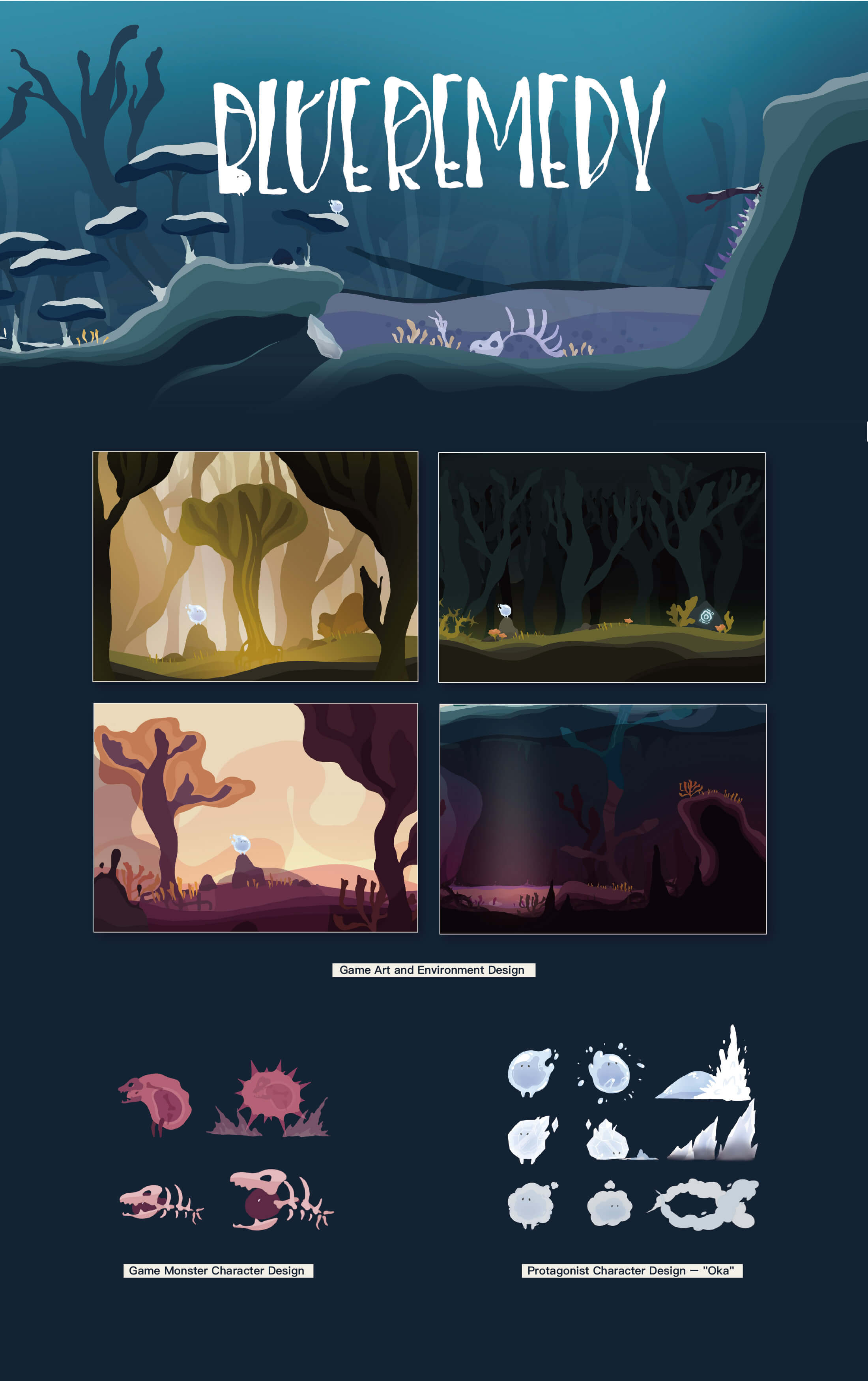 Blue Remedy is a 2D side-scrolling game that combines adventure and puzzle mechanics to depict a world consumed by pollution. Created as a university capstone project, it explores seasonal environments—spring, summer, autumn, and winter—each reimagined with visual motifs of contamination. The project was a finalist in both Game Concept and PC Game categories at the 2020 CSS Design Awards (放視大賞).